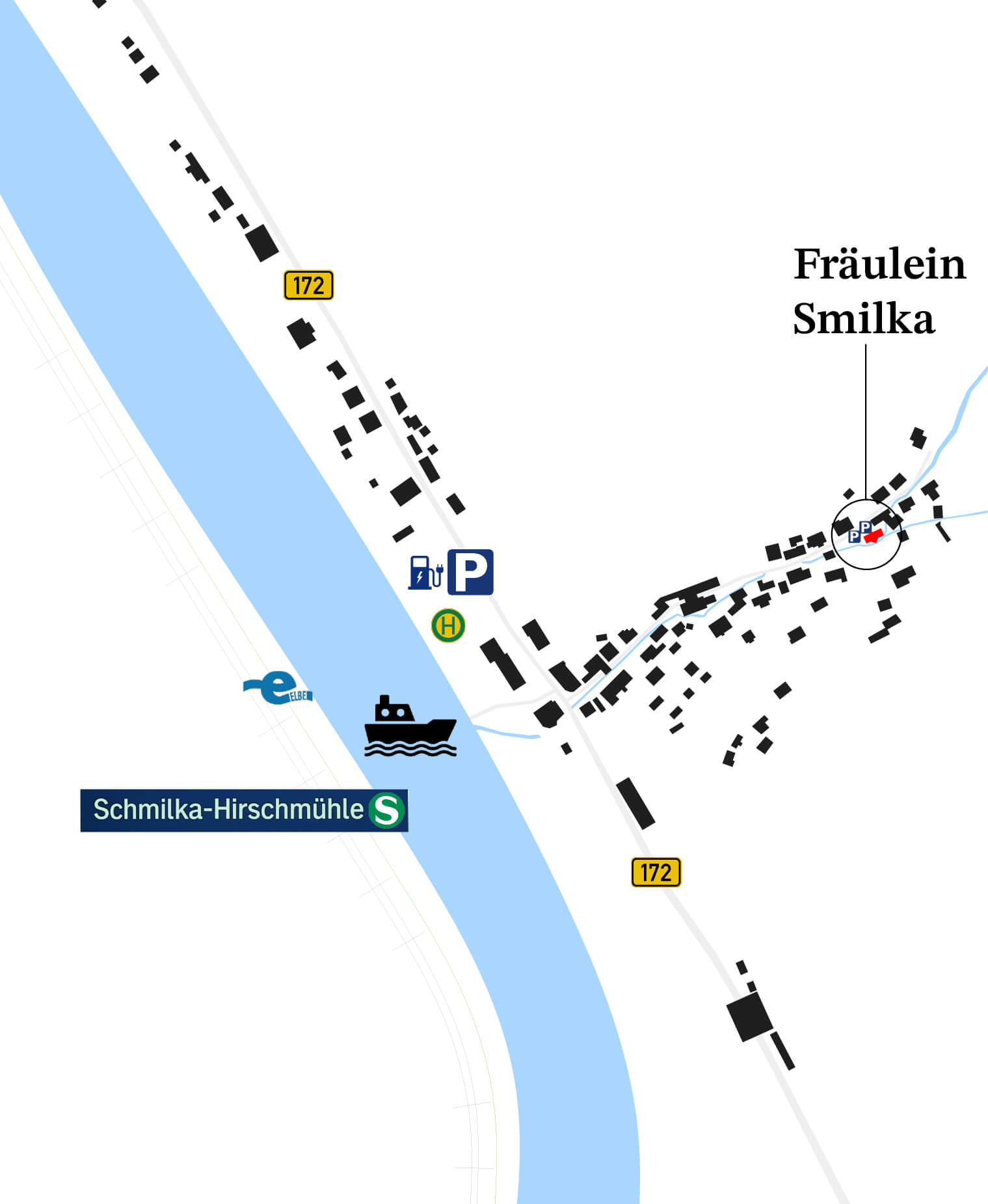 »Fräulein Smilka« liegt im kleinen Grenzort Schmilka am Fuße des Großen Winterbergs inmitten des Nationalparks Sächsische Schweiz. Umgeben ist es von bewaldeten Hängen und aufragenden Felsformationen. Der Ilmenbach schlängelt sich talwärts durch das Dorf, treibt eine Mühle an und mündet neben der Anlagestelle der Fähre in die Elbe. Bereits im frühen 19. Jahrhundert wird Schmilka zum beliebten Ausgangspunkt für beginnende touristische Aktivitäten und Wanderungen, ausgelöst auch durch die Zeichnungen und Gemälde der Maler der Romantik.